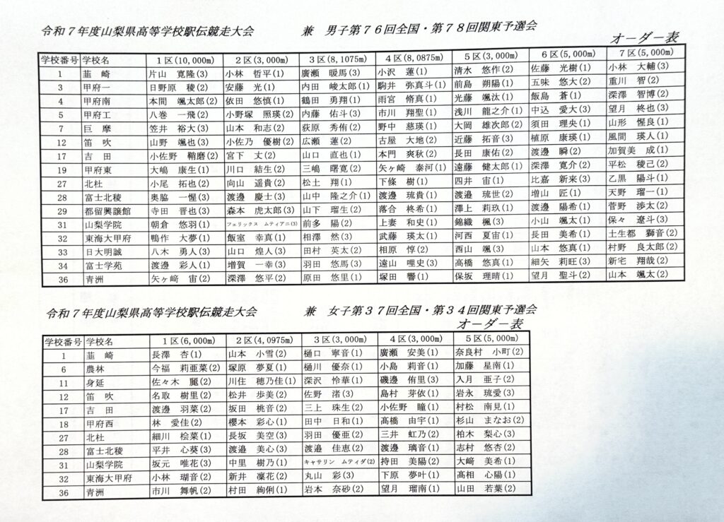 2025年度県高校駅伝、男子、女子ともに山梨学院が優勝2025年10月25日トピックス,大会情報 10月25日(土)は西湖湖畔で山梨県高等学校駅伝競走大会でした。男子、女子ともに山梨学院が優勝しました。 大会ページ